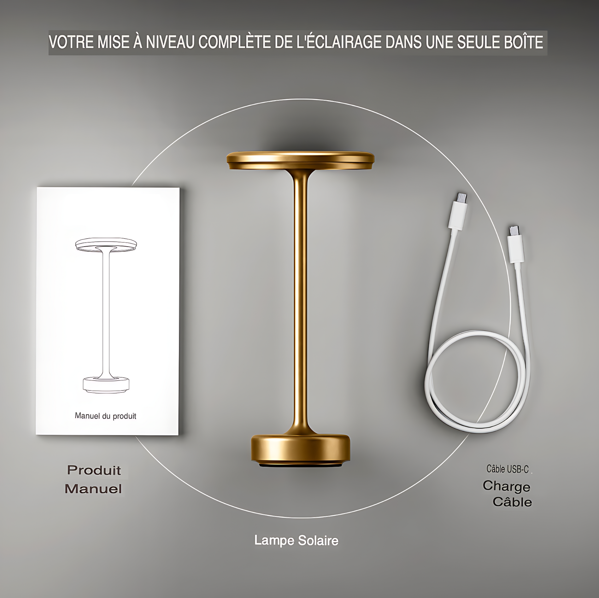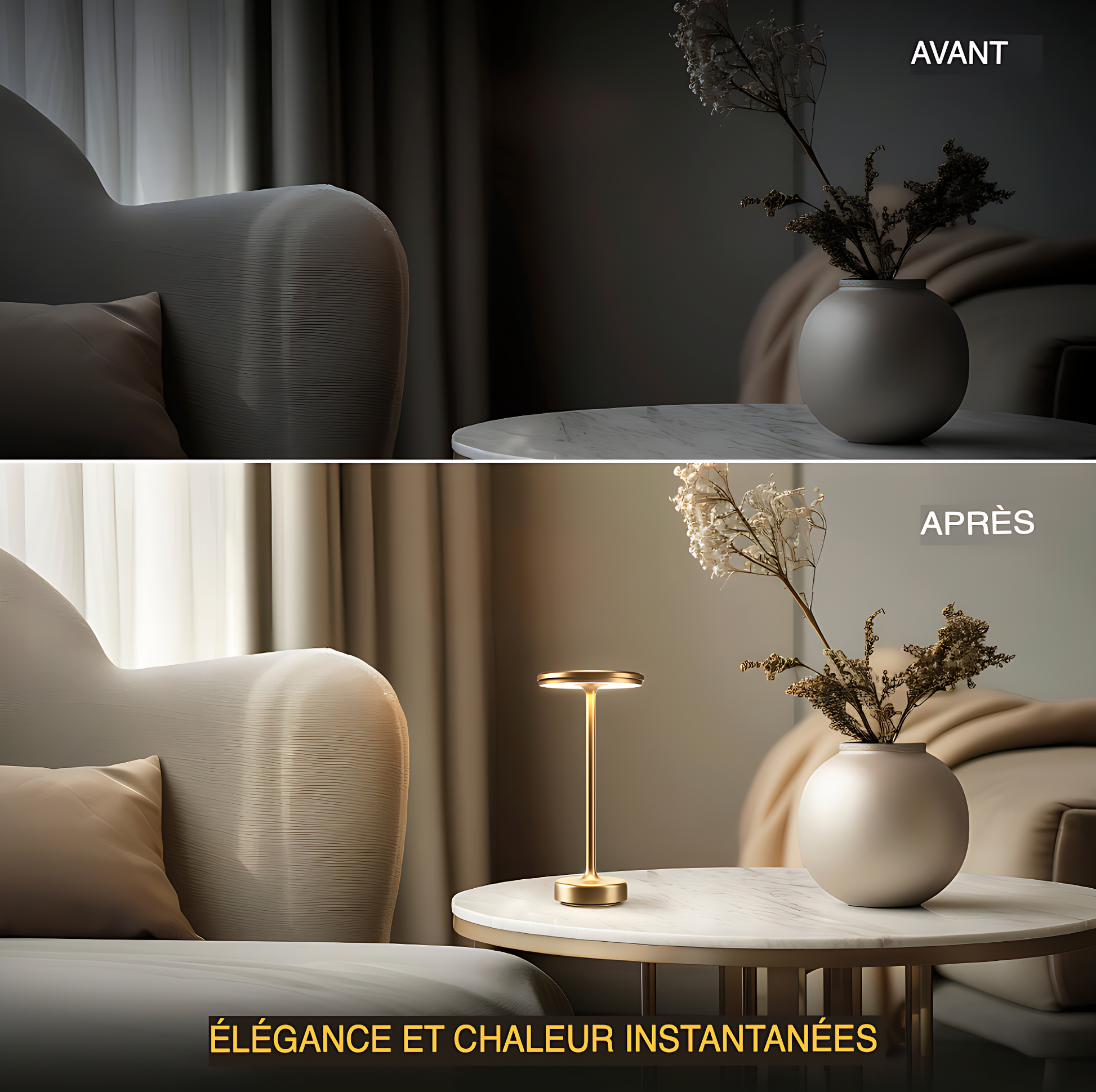 Découvrez LumiTouch, notre élégante lampe de table sans fil LED signée LumiTech, disponible en noire, grise et dorée.